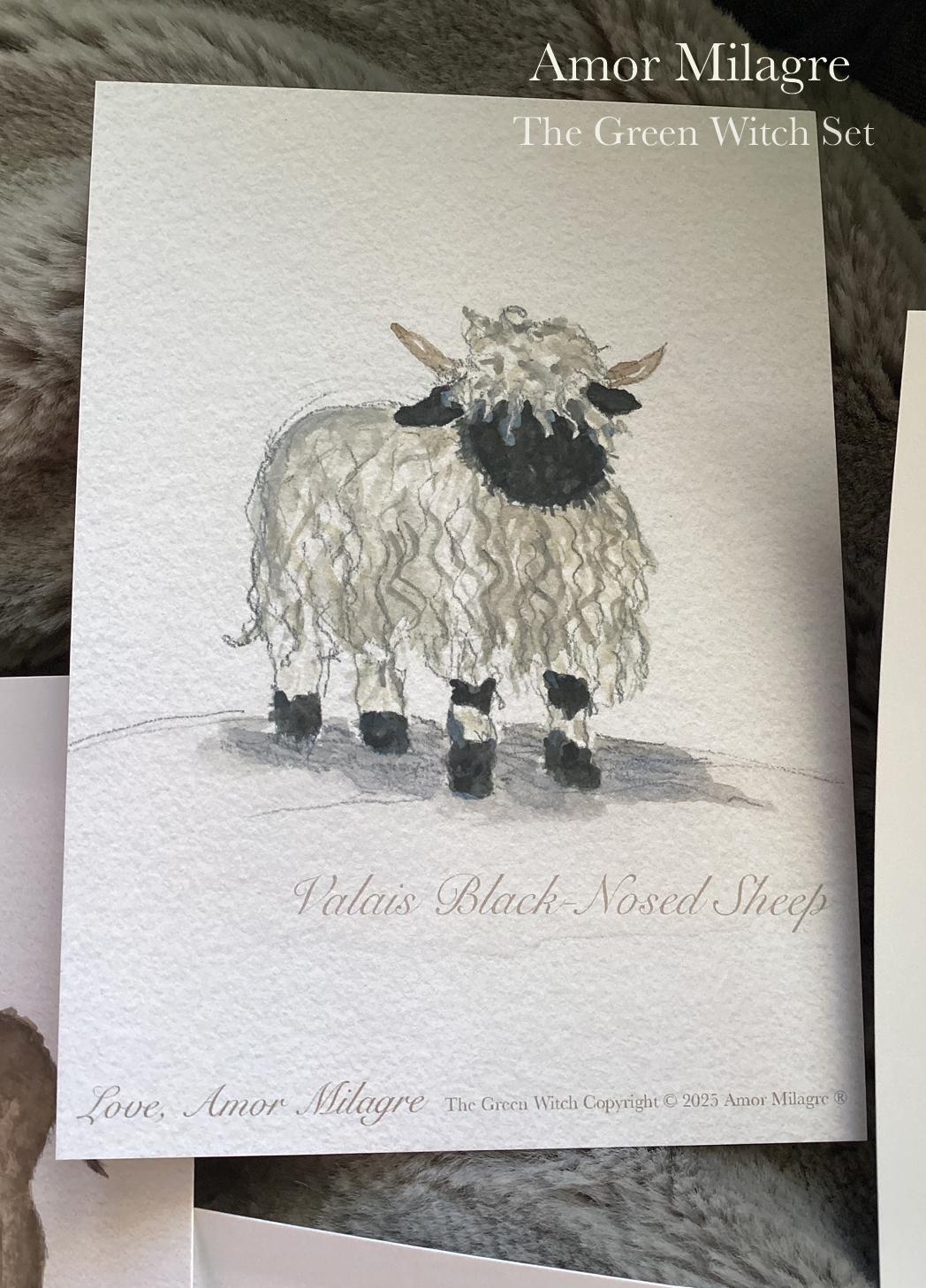 Amor Milagre The Green Witch Magical Baby Animals Book Illustration Watercolour Baby & Child Greeting Card Set, Valais Black-Nosed Sheep